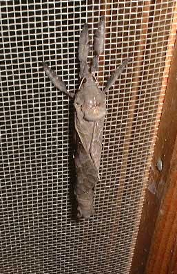 実は私、子供の頃は虫が大嫌いで、3歳の頃に山に出かけた折一人で遊んでいると突然火がついたように泣き出したので両親が駆け寄ってみると、腕にハエが一匹とまっていた...という逸話の持ち主です。 「男の子なのにねえ...」という周囲のため息が聞こえてきそうです。 昆虫図鑑のページをめくるのもいやだったくらいでした。 ところが最近、なぜか虫に興味がありまして(いまだに触るのはニガテなんですが...) 「むし探検広場」も楽しく読ませていただいていました。 今回意を決して(?)メール差し上げることにしました。 長い前置きになりましたが、さて、ここから本題を書かせていただきます。 去年の夏長野県・軽井沢地方を旅行しました際、不思議な蛾を見つけました。 夜は「ブロロロロロ....」という派手な音を立てながらゆらゆら飛び姿はそれまで見たことがないちょっと奇怪なもの。 当然のように昼はじーっとしています。 これは「コウモリガ」なのでしょうか。 たしかにクリの木が生えているところでした。 もしそうなら調べれば調べるほど害虫のようであり、幼虫が漢方の原料だともいうしなんだかミステリアスな虫ですが、今ひとつよく分かりません。 ウェブサイトに画像が載っていたんですが、同じものなのかちょっと判別できませんでした。 それでは失礼いたします。 ![]()