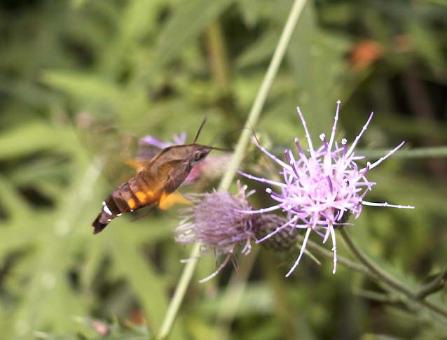 昼間に飛び回り、ツリフネソウ、ホウセンカなどの花で、ホバリングしながら長い口を伸ばして吸蜜する。胴体が太く、素早く羽ばたくのでハチのように見える。住宅地周辺でも見られる。
