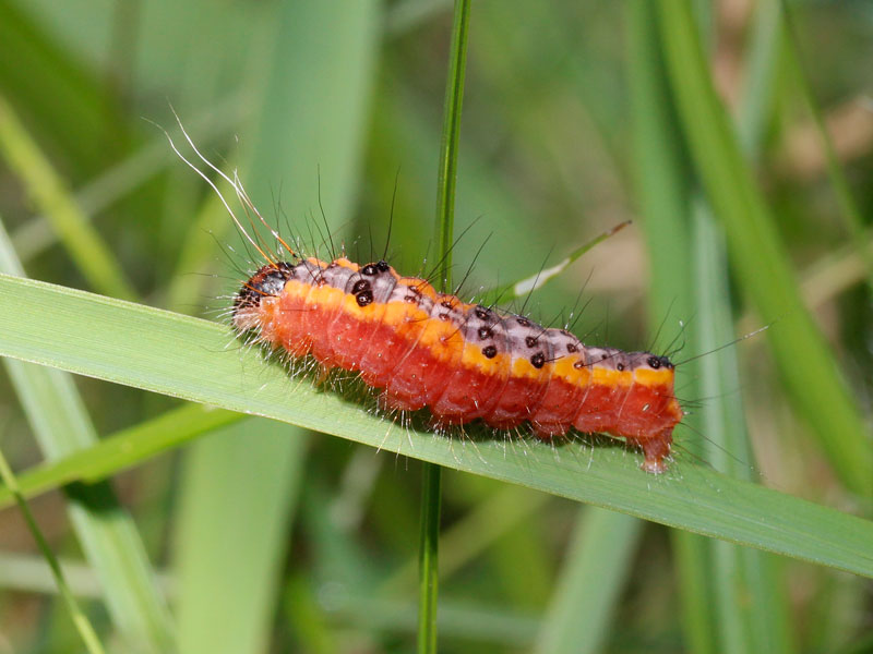 前方に伸びた白いムダ毛が魅力のサクラケンモンの幼虫は、蛹化間近の年頃になったので、緑色の体が赤く色づいていました。