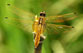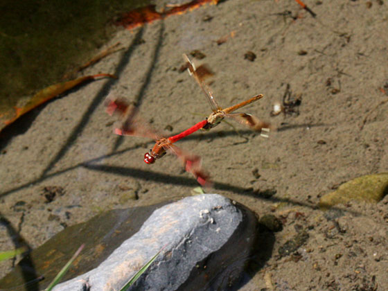 午前11時の河原。ミヤマアカネのカップルが、つながりながら打水産卵していました。「彼女はボクが守り抜く!」。真っ赤に色づいたオスの心意気です。