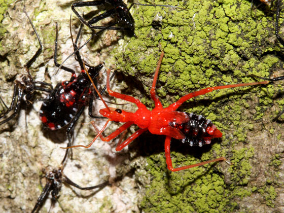 午後2時の並木道。街路樹の幹に、ヨコヅナサシガメの幼虫たちがたむろしていました。真っ赤なのは、脱皮したての証拠。時間がたてばノーマルな黒色に変身します。