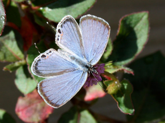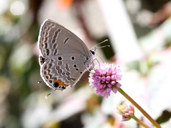 午前10時の住宅地。プランターの花に蝶が‥。可愛いけど、ちょっと見慣れないゾと思ってよく見たら、クロマダラソテツシジミでした。南国から関西にやって来た新参者です。